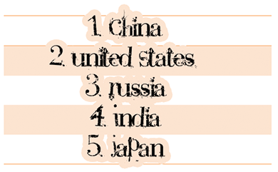 Naturally, Countries with biggest industries, biggest production capabilities and the biggest populations top the lists. Top five are China, USA, Russia, India and Japan.