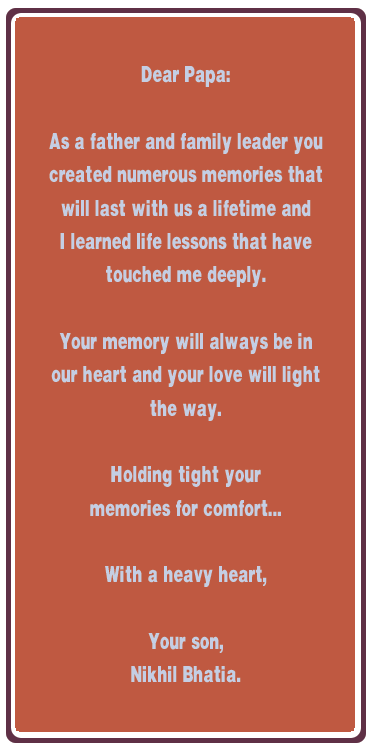 Gone But Not Forgotten, “Bhatia ji" (as lovingly called by many) will always be with us. Death is not the end, Death can never be the end...