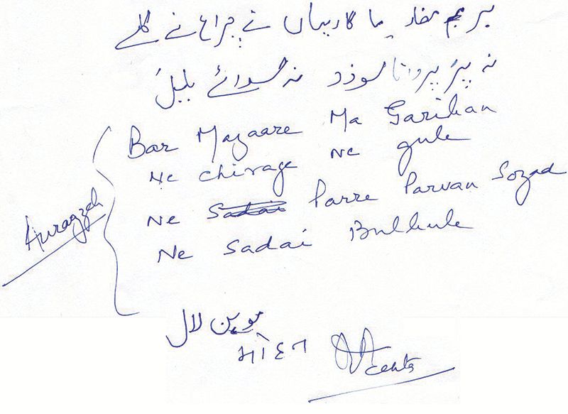 About a decade before he passed away, once, I asked him for his favourite poem. He wrote an Urdu Sher (poetic verse) on a paper and gave it to me. He said this verse is accredited to Bahadurshah Zafar by some and by some others to Aurangzeb. I still have that saved paper (photograph below).